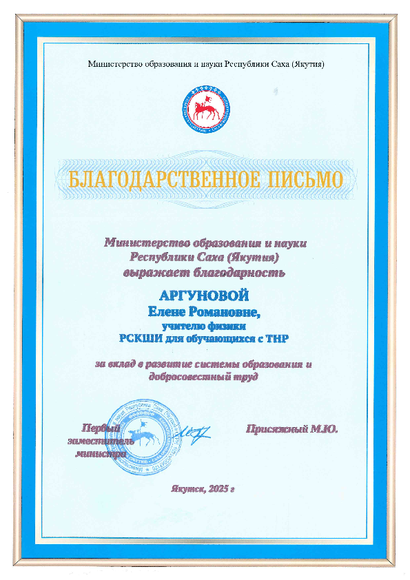 Благодарственное письмо Министерства образования и науки РС(Я) за вклад в развитие системы образования и добросовестный труд г. Якутск, 2025 г.